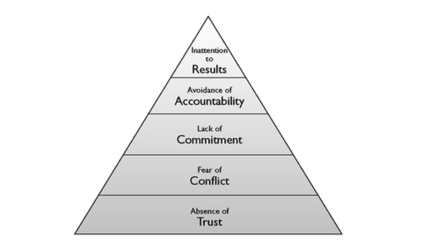The author explains razor sharp that trust is the essential foundation of highly effective teams (and organizations). As can be seen from the layered pyramid below, lack of trust in the end leads to inattention to results.