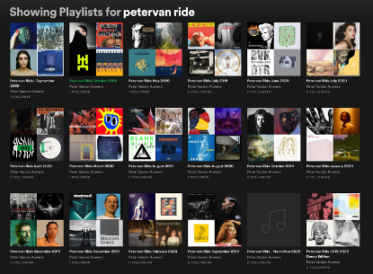 Since July 2019, I publish every month a Spotify List with new releases combined with some oldies from the 60ies, 70ies, and beyond. Search for “Petervan Ride” and select “playlists”. Subjective selection of course, as driven only by my personal taste (or lack thereof).