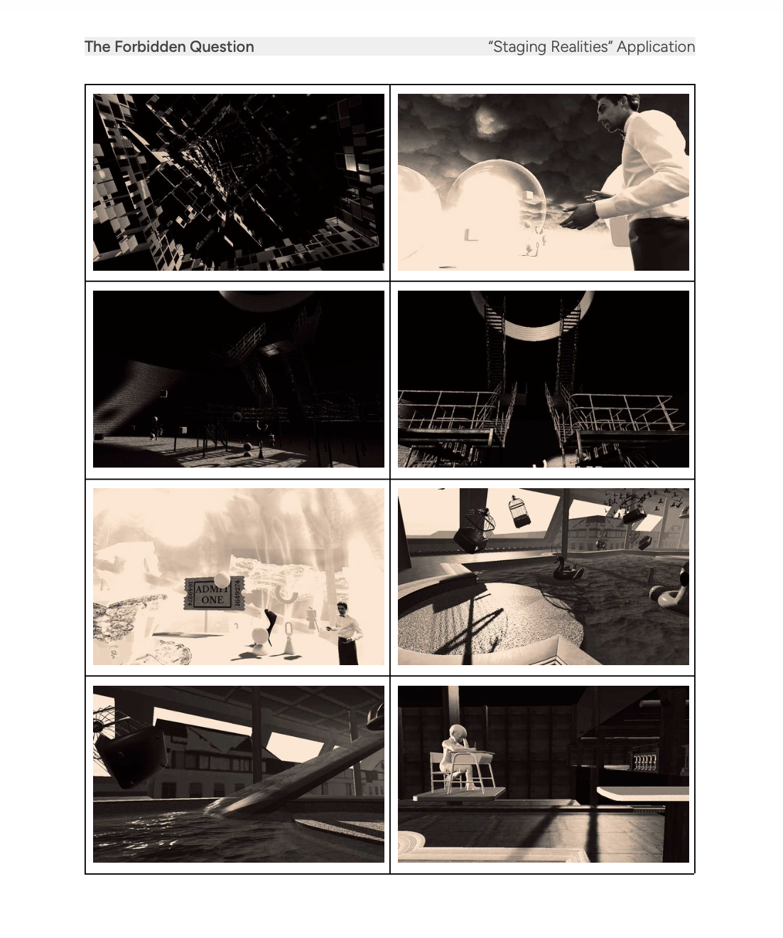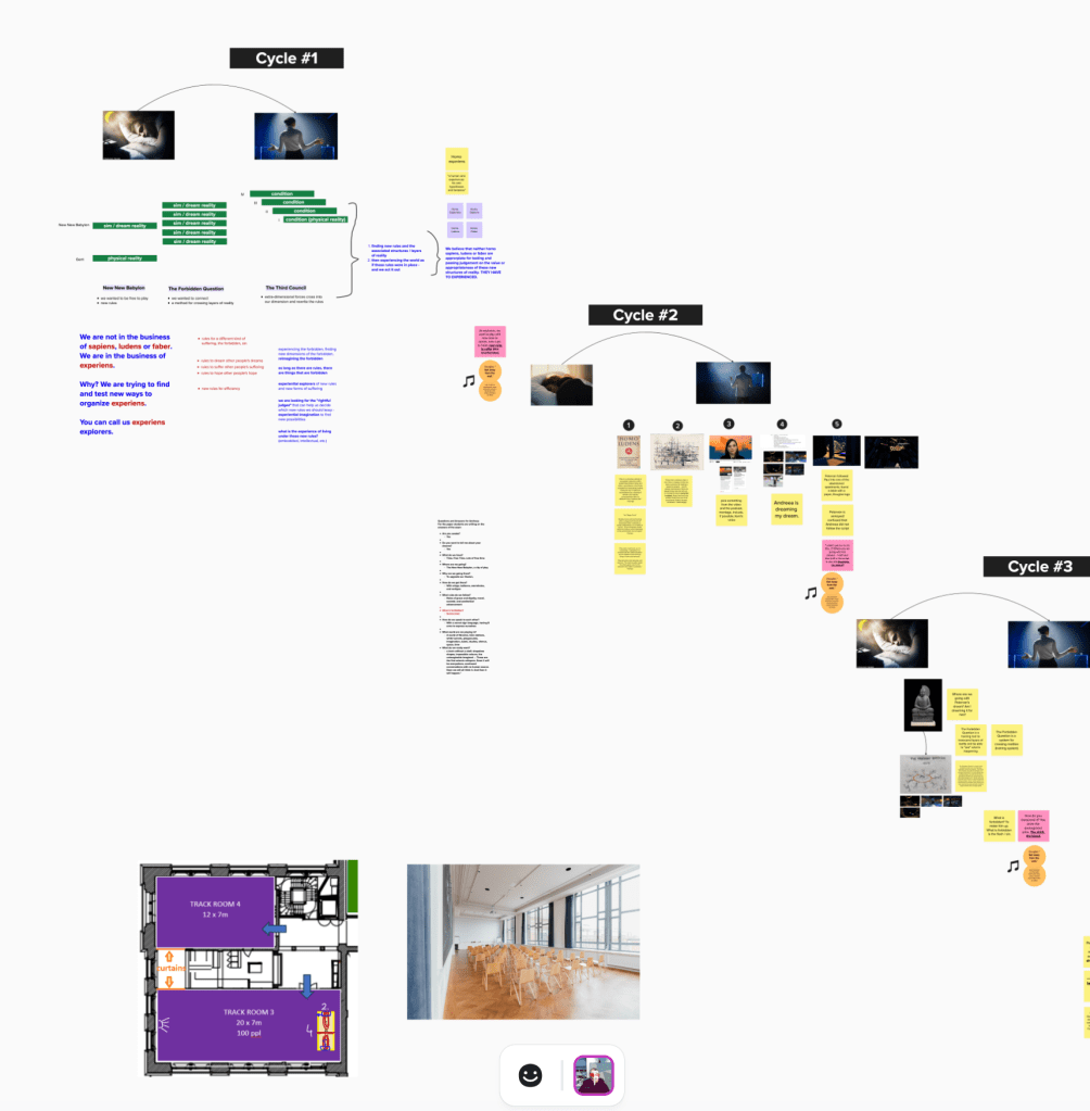 In preparation for our talk at UnitedXR, Andreea and I had many online sessions on the mood and conceptual flow of our presentation (Mural extract below). We wanted to present a coherent journey from New New Babylon to The Forbidden Question to The Third Council.
