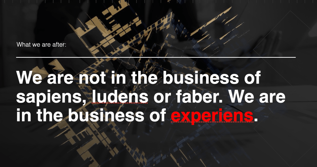 Hence Homo Experiens. With an “s” to differentiate from the words “Narrative” and “Experience” that have become catch-all words.