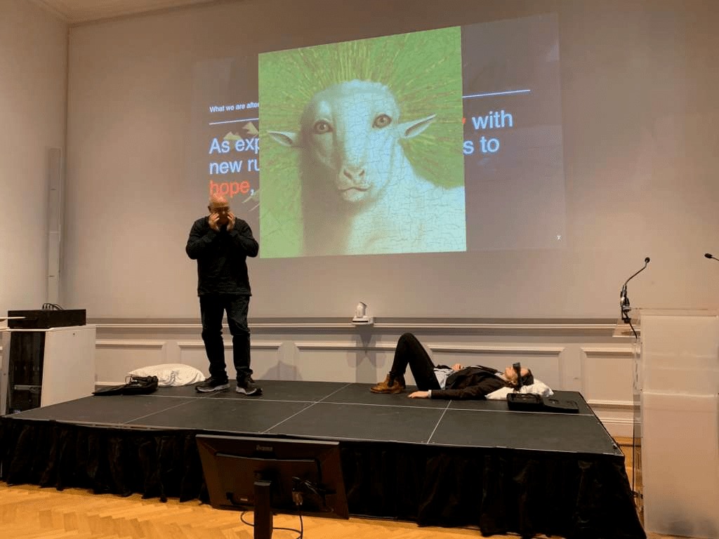 On 9 Dec 2025, Andreea and I gave a “talk” about our journey and lessons learned in creating The Forbidden Question. Rather than a talk, it was a performance about the performance. The talk also includes a speaking lamb from Van Eyck’s famous 1432 Ghent Altarpiece. See the lamb in the video of our talk below. At the end, you will also see a strange character running away with the stolen 12th panel of the Altarpiece.