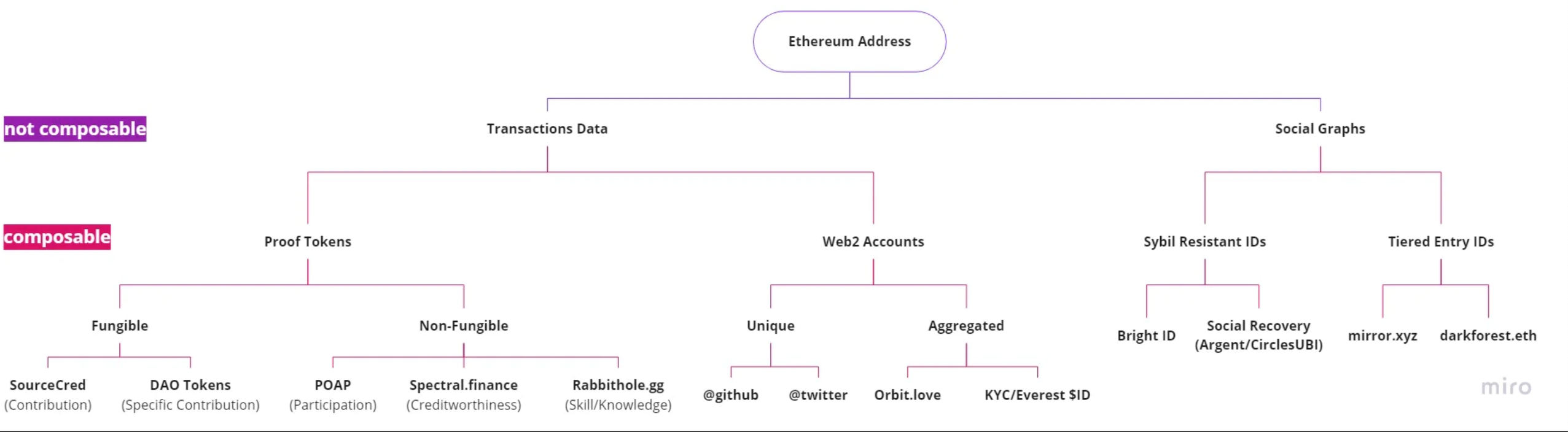 Andrew Hong writes: “The second layer (and onwards) highlights categories and products that allow us to represent that transaction data and/or social graph as tokens. Since tokens have the qualities of existence, flexibility, and reusability – then by the transitive property – our digital identity now does as well. I can move around these tokens at will to different accounts and in different combinations.”