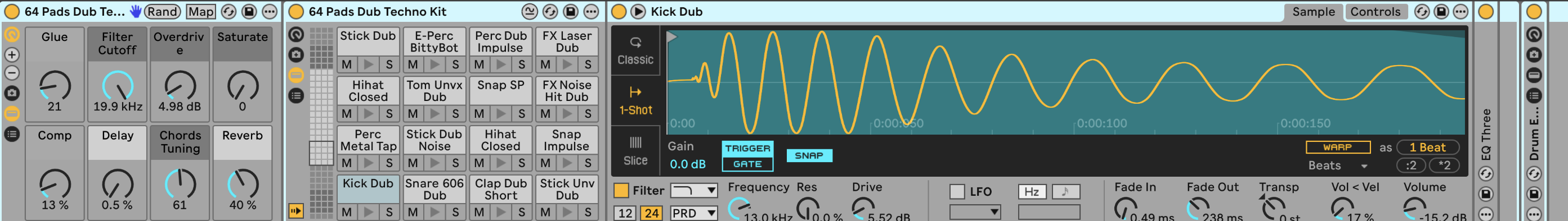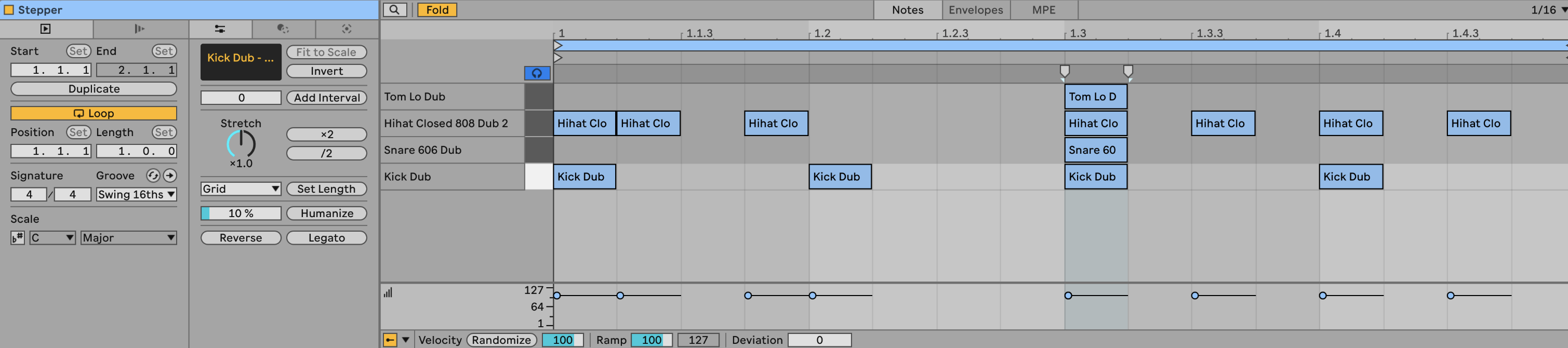 I started implementing them into Ableton Live. Here is an example of the “stepper” variant on a 64 Pads Dub Techno Kit.